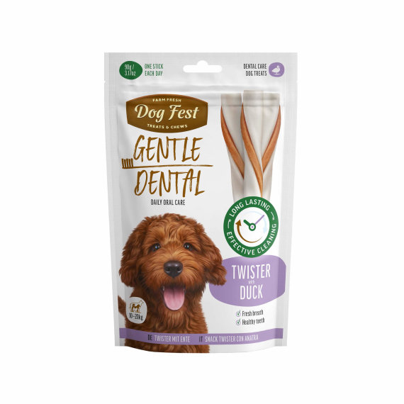 Dog Fest Poslastica Twister - Patka - je ukusna i funkcionalna dentalna poslastica posebno oblikovana za pse srednje veličine (10–20 kg). Dental Twister s patkom kombinira prirodne sastojke i posebnu teksturu koja pomaže očistiti zube, osvježiti dah i pruža dugotrajnu zabavu vašem psu.