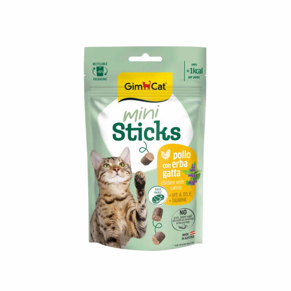 GimCat Mini Sticks s piletinom i mačjom metvicom savršeni su mini zalogaji za svakodnevnu poslasticu. Ovi mesnati štapići odlikuju se visokim udjelom proteina i dodatkom vitamina A, D3, E i taurina za zdravlje vaše mačke. Proizvedeno u Austriji, garantirane kvalitete