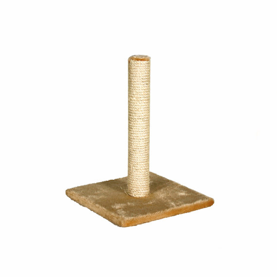 Grebalica za mačke s kompaktnom podlogom četvrtastog oblika od pliša i centralnim stupom koji je omotan čvrstim užetom od sisala.