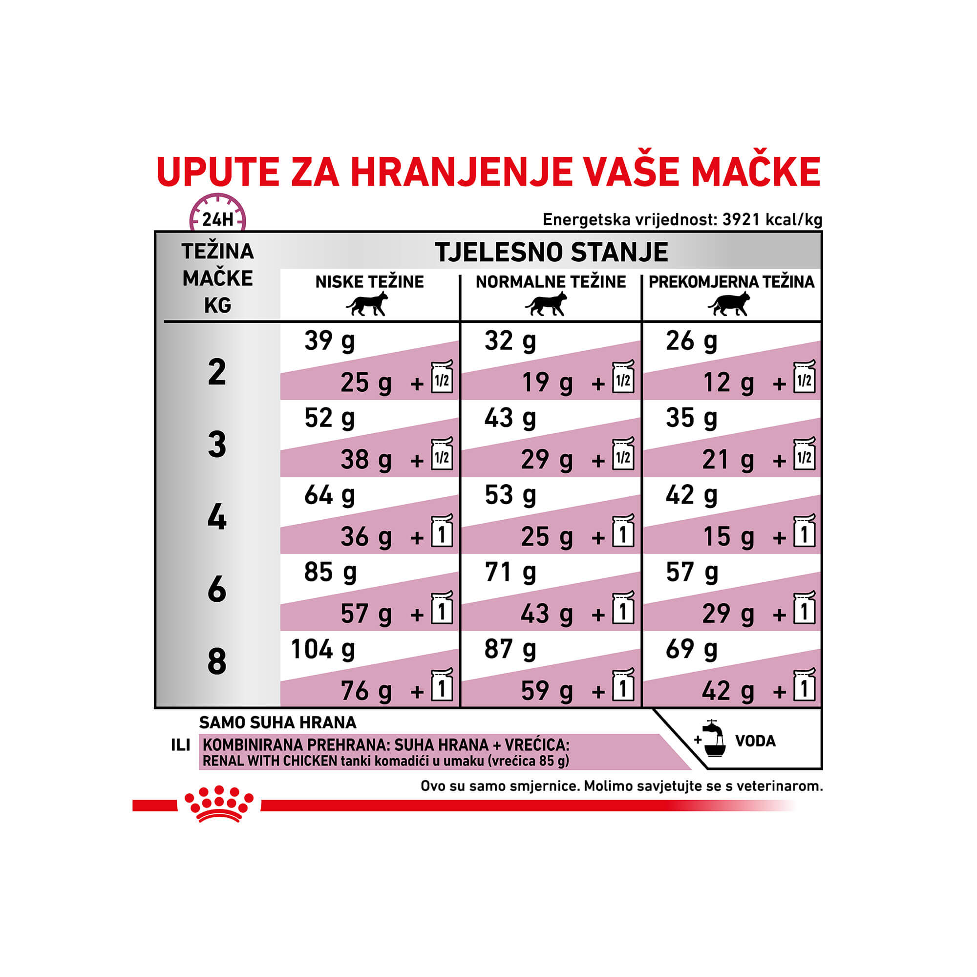 Preporuke: Preporuča se prije korištenja ili produženja korištenja zatražiti savjet veterinara. U početku koristite RENAL suhu hranu do 6 mjeseci u slučaju kronične bubrežne insuficijencije i za smanjenje stvaranja oksalatnih kamenaca.